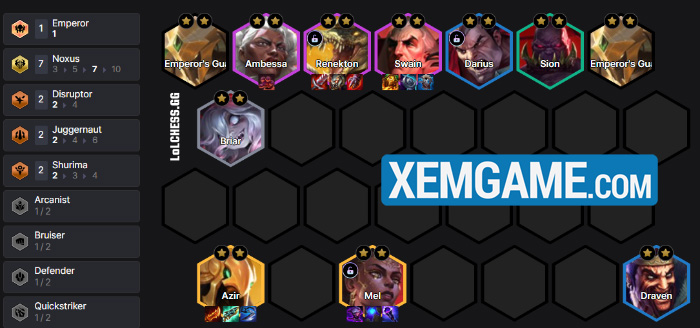 Theo đó, với việc Leblanc có một form giữ máu cực ổn cùng Orianna trong giai đoạn đầu ở 16.3b, người chơi có thể dùng lượng máu đó để lên 8 và roll tìm Ambessa 2 sao rồi mở khóa Mel rất sớm. Từ đó chúng ta sẽ chuyển sang form 7 Noxus quen thuộc và thêm bộ Shurima với Azir/Renekton để đánh late. Một form khác là có thể xây dựng nên từ Draven Cuồng Đao farm vàng up cấp, nói chung là khá flex.