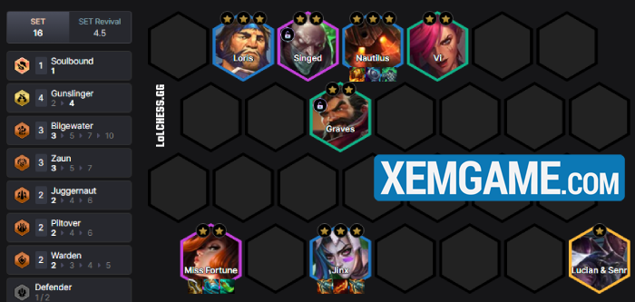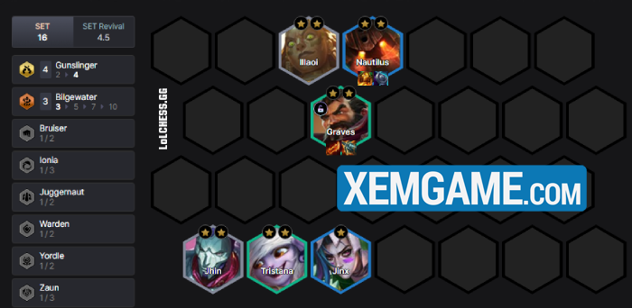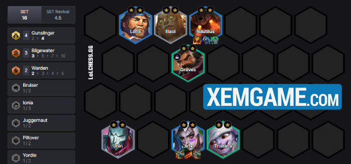 Để chơi đội hình này, chúng ta nên bắt đầu bằng Bilgewater để có thể mở khóa Graves. Dùng khung Đấu Sĩ (từ Illaoi) cho đến khi ra Nautilus :