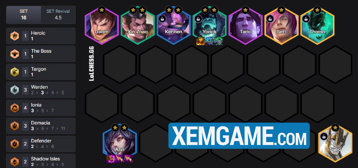 Nếu đang chuỗi thắng có thể up lên 8 ở 3-7 để lấy Thresh, còn không thì chậm lại vài vòng để giữ vàng thật nhiều có thể. Vì dù sao chúng ta cũng sẽ cần giữ lại nhiều đơn vị Demacia để mở Galio (8 cấp sao Demacia, nghĩa là Xin Zhao 2 sao + 6 vị tướng Demacia khác 1 sao – mở trong vòng quái), lý tưởng nhất là mở cùng lúc Galio và Sett ở 4-6 rồi bán hết Demacia chỉ giữ lại Garen :