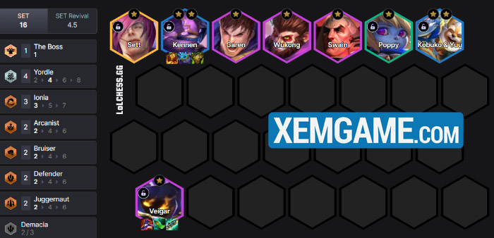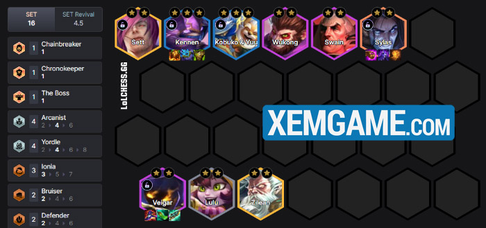 Về trang bị thì Veigar sẽ cầm bộ năng lượng + AP khá cơ bản với Shojin, Mũ Phù Thủy… Kennen 3 sao hoặc Wukong/Swain sẽ cầm 3 món đồ tank flex trong khi Sylas mang đến các trang bị đấu sĩ phép.