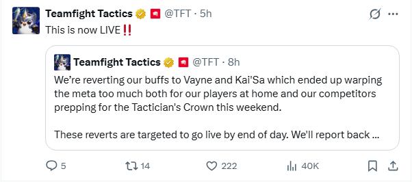 ĐTCL 16.7 đã giới thiệu một đội hình cực mạnh với 2 chủ lực Kai’Sa và Vayne, vậy nên chúng đã bị cân bằng lại trong bản vá b để chuẩn bị cho CKTG ĐTCL cuối tuần này.