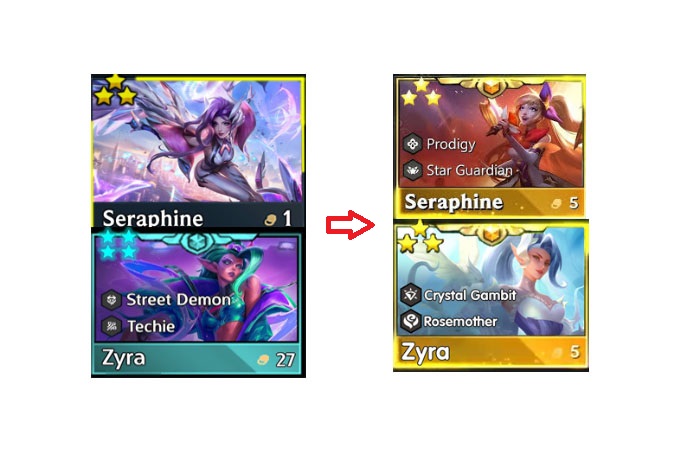 Còn nhớ vào giai đoạn cuối mùa 14, Zyra và Seraphine (đều là tướng 1 vàng) đã được buff mạnh và thêm hiệu ứng vào trong phiên bản cuối cùng, đến mùa 15 thì chúng bất ngờ trở thành tướng 5 vàng chủ lực của mùa sau.
