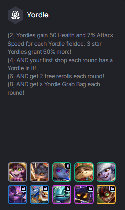 - (2) Yordles nhận 50 Máu và 7% tốc đáh cho mỗi Yordle trên sân. Yordles 3 sao cho thêm 50% chỉ số!