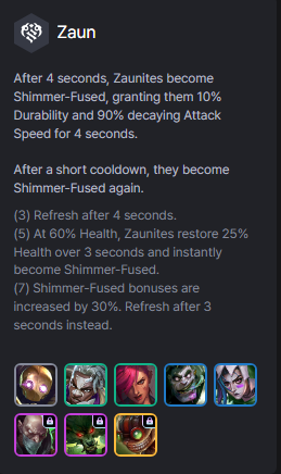 Mỗi 4 giây, tướng Zaun được bú Shimmer, tăng thêm 10% Chống Chịu và 90% tốc đánh giảm dần trong 4 giây. Sau một khoảng nghĩ, chúng lại được bú đồ tiếp.