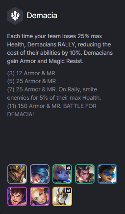 Mỗi khi cả đội mất 25% Máu tối đa, các Demacia sẽ tập trung lại, giảm năng lượng các kỹ năng đi 10%. Demacia nhận thêm giáp/kháng phép.