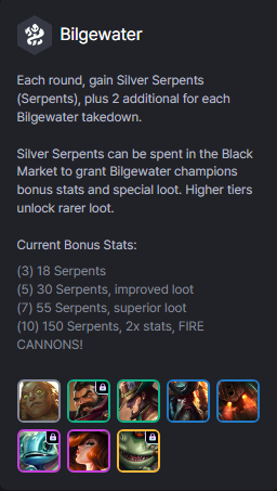 Sau mỗi vòng, nhận đồng Ngân Xà và 2 thêm cho mỗi hạ gục từ tướng Bilgewater. Ngân Xà có thể dùng để mua đồ trong Chợ Đen để tăng cường chỉ số cho Bilgewater hay các món đặc biệt. Các tướng cấp độ càng cao mở khóa đồ càng mạnh.
