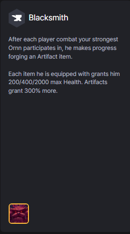 Sau mỗi giao tranh mà có Ornn mạnh nhất tham gia, nó sẽ bắt đầu rèn Tạo Tác. Mỗi trang bị trên người Ornn cho nó thêm 200/400/2000 Máu tối đa. Tạo Tác cho gấp 3.