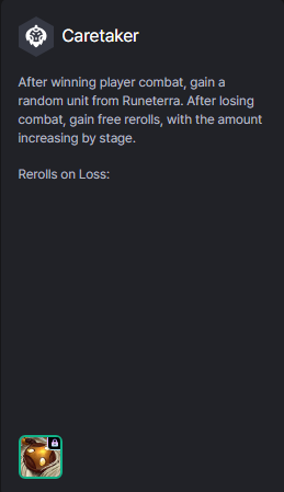 Sau khi thắng giao tranh người chơi, nhận 1 đơn vị ngẫu nhiên từ Runeterra. Thua giao tranh nhận 1 reroll miễn phí, con số reroll này tăng theo giai đoạn.