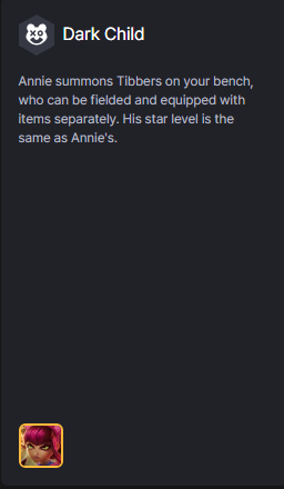Annie triệu hồi Tibbers trên hàng chờ, Tibbers sẽ như 1 tướng thường riêng biệt và có thể dùng trang bị. Cấp sao ngang với Annie.