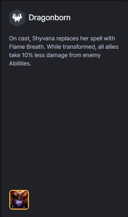 Khi dùng chiêu, Shyvana thay thế kỹ năng với Thổi Lửa. Khi hóa hình, tất cả đồng minh giảm 10% sát thương nhận vào từ kỹ năng của địch.
