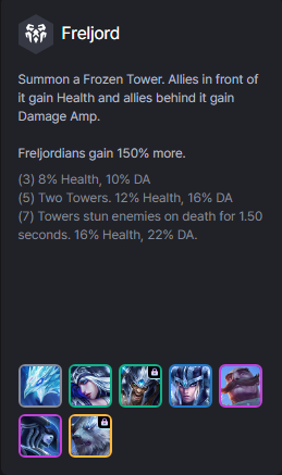 Triệu hồi 1 Tháp Băng. Đồng minh trước nó nhận Máu trong khi đồng minh đằng sau nhận Khuếch Đại Sát Thương. Tướng Freljord nhận gấp 150%.