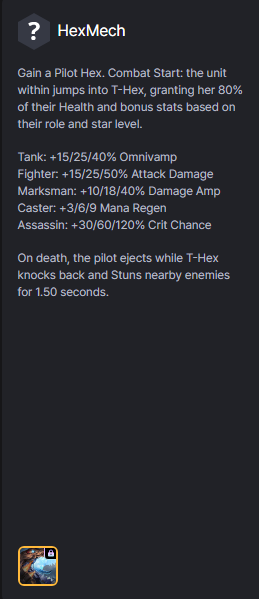 Nhận 1 ô Phi Công. Bắt đầu giao tranh, tướng ở ô Phi Công nhảy vào T-Hex, cho nó 80% Máu và chỉ số thêm dựa trên Vai Trò và cấp sao của chúng.