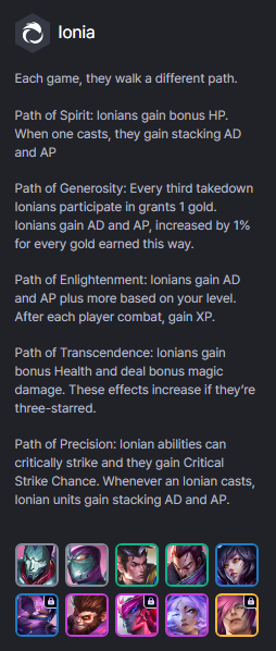 - Đạo của Chính Xác: Kỹ năng các tướng Ionia có thể chí mạng và chúng nhận thêm tỉ lệ chí mạng. Khi 1 tướng dùng kỹ năng, các tướng khác nhận cộng dồn SMCK/SMPT.