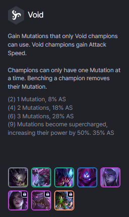 Tướng : Kog’Maw 1 vàng, Cho’Gath 2 vàng, Rek’Sai 2 vàng, Malzahar 3 vàng, Bel’Veth 4 vàng, Kai’Sa 4 vàng (cần mở khóa), Sứ Giả Hư Không 4 vàng (cần mở khóa), Baron 7 vàng (cần mở khóa).