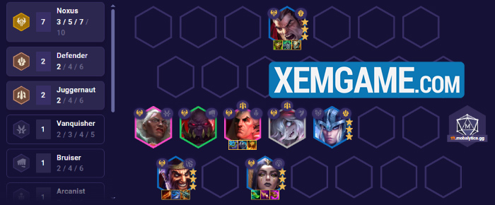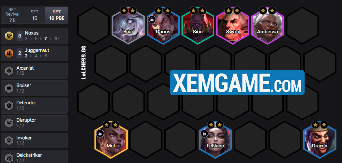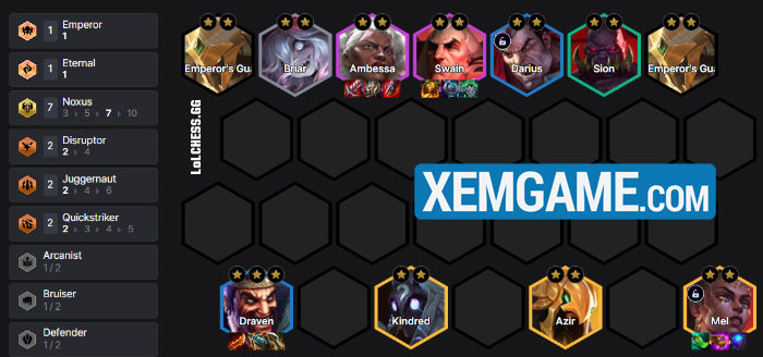 Với 8 tướng và không cho hiệu ứng chiến đấu trực tiếp nào, sức mạnh của Noxus dựa hoàn toàn vào đồ đạc và Atakhan để chiến thắng đối thủ. Trong đó chúng ta chỉ có điểm chung là Dũng Sĩ (Briar và Swain) và có khá nhiều Hệ khác để flex vào như Đấu Sĩ, Vệ Quân, Cực Tốc, Thuật Sư tùy vào carry hiện tại đang là gì.