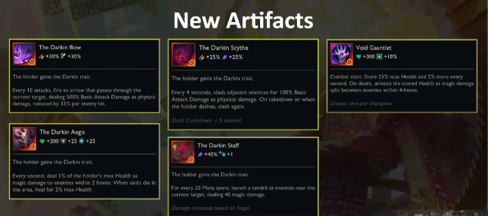 Theo đó các trang bị Tạo Tác Darkin không chỉ cho hiệu ứng đặc biệt giống Tạo Tác bình thường mà còn khiến tướng sở hữu sẽ có thêm hệ Darkin :