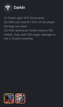 - (3) Và mỗi khi Darkin hồi 100 Máu, chúng gây 100 sát thương phép cho 2 kẻ địch kề bên