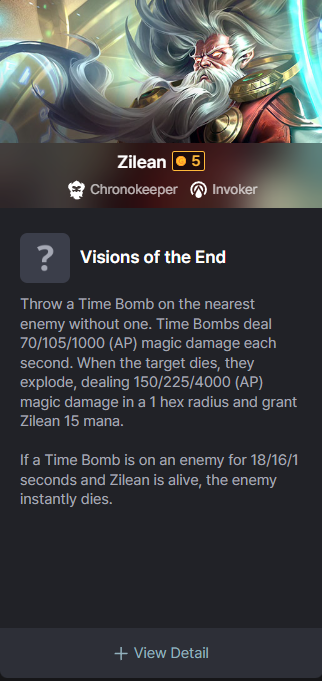 Ném một Bom Thời Gian lên kẻ địch gần nhất chưa có bom. Bom Thời Gian gây 70/105/1000 (SMPT) sát thương phép mỗi giây. Khi mục tiêu chết, chúng phát nổ, gây 150/225/4000 (SMPT) sát thương phép trong phạm vi 1 ô và hồi cho Zilean 15 Mana. Nếu một kẻ địch mang Bom Thời Gian trong 18/16/1 giây và Zilean vẫn còn sống, kẻ địch đó sẽ chết ngay lập tức.