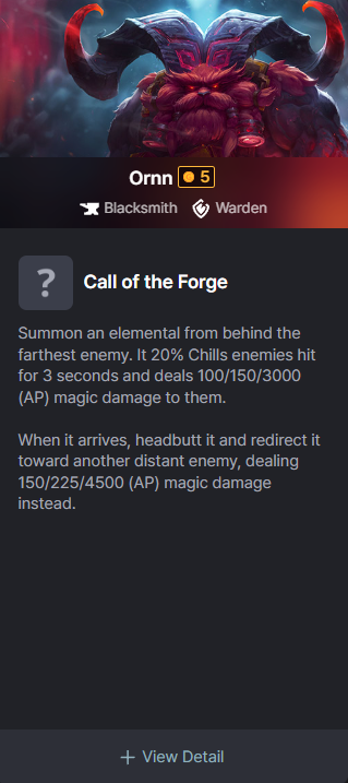 Tóm lấy mục tiêu và dậm chúng về phía trước, gây 220/330/9999 (SMPT) + 8/12/900% (SMPT và Máu tối đa của chúng) thành sát thương phép lên chính mục tiêu. Tất cả kẻ địch khác trong phạm vi 3 ô chịu 50% tổng sát thương gây ra.