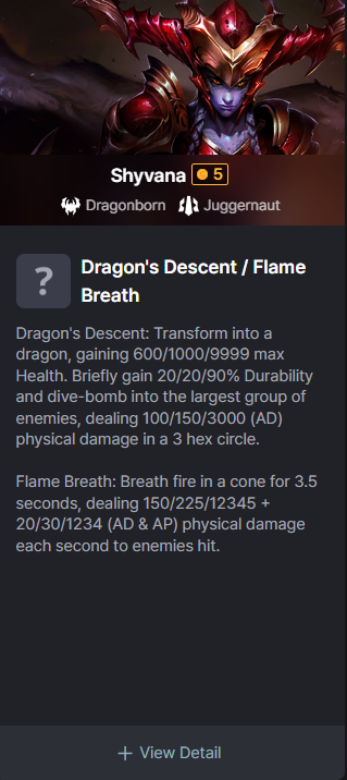 Hóa rồng : Hóa thành rồng, nhận thêm 600/1000/9999 Máu tối đa. Tạm thời nhận 20/20/90% Chống chịu rồi lao xuống cụm kẻ địch đông nhất, gây 100/150/3000 (STVL) sát thương vật lý trong một vòng tròn bán kính 3 ô.