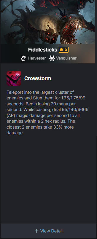 Trong khi đang niệm chiêu, gây 95/140/6666 (SMPT) sát thương phép mỗi giây lên tất cả kẻ địch trong phạm vi 2 ô. 2 kẻ địch gần nhất nhận thêm 33% sát thương.