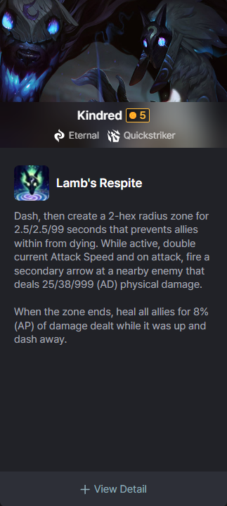 Lao tới, rồi tạo một vùng bán kính 2 ô tồn tại trong 2.5/2.5/99 giây, ngăn đồng minh bên trong khỏi bị hạ gục. Trong thời gian hiệu lực, nhân đôi Tốc độ Đánh hiện tại và khi tấn công sẽ bắn thêm một mũi tên phụ vào một kẻ địch gần đó, gây 25/38/999 (STVL) sát thương vật lý. Khi vùng biến mất, hồi máu cho tất cả đồng minh bằng 8% (SMPT) lượng sát thương đã gây ra trong lúc vùng tồn tại rồi lướt ra xa.