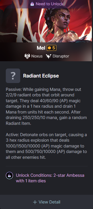 Nội tại: Khi nhận Mana, phóng ra 2/2/9 quầng sáng bay quanh mục tiêu. Chúng gây 40/60/90 (SMPT) sát thương phép trong phạm vi 1 ô và rút 1 Mana từ các đơn vị trúng phải mỗi giây. Sau khi rút tổng cộng 250/250/10 Mana, nhận một Trang Bị Ánh Sáng ngẫu nhiên.
