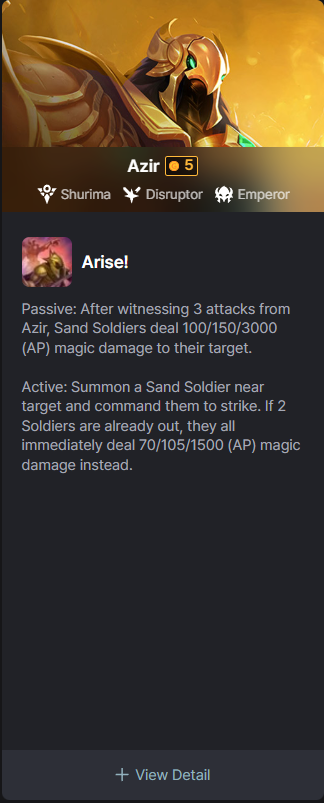 Nội tại : Sau khi chứng kiến 3 đòn đánh từ Azir, các Binh Lính Cát gây 100/150/3000 (SMPT) sát thương phép lên mục tiêu của chúng.