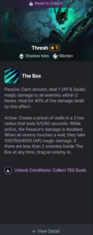 Nội tại: Mỗi giây, gây X (sát thương phép theo Linh Hồn) sát thương phép lên tất cả kẻ địch trong phạm vi 2 ô. Hồi máu bằng 40% lượng sát thương gây ra bởi hiệu ứng này.