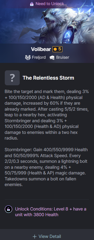Thần Sấm: Nhận thêm 400/550/9999 Máu và 50/50/999% Tốc Độ Đánh. Mỗi 2/2/0.3 giây, triệu hồi một tia sét đánh vào kẻ địch gần đó, gây 4% + 50/75/999 (sát thương Kỹ Năng theo Máu) sát thương phép. Mỗi lần hạ gục sẽ triệu hồi một tia sét đánh vào kẻ địch vừa bị hạ.