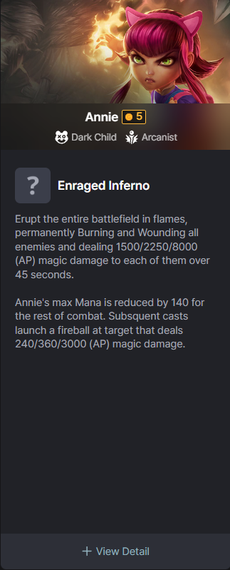 Năng lượng tối đa của Annie sẽ giảm đi 140 (0/160=>0/20) cho đến hết giao tranh. Kỹ năng sẽ bị thay thế bằng một quả cầu lửa vào mục tiêu gây 240/360/3000 (SMPT) sát thương phép.