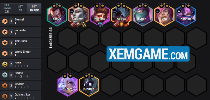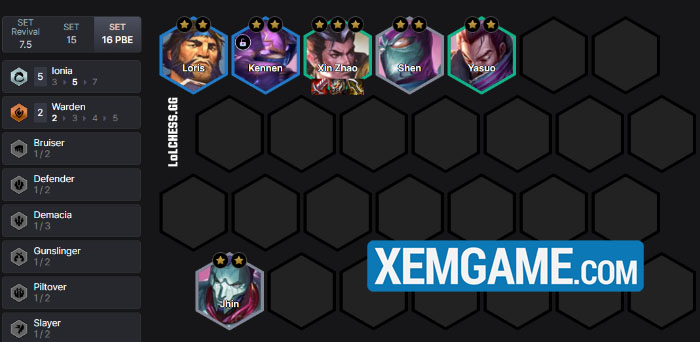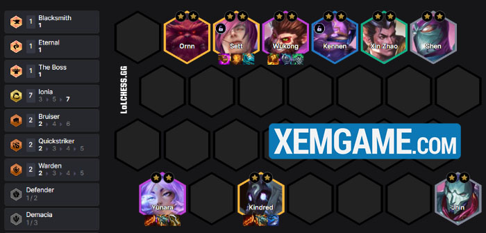 Về lối chơi, thì hiện tại có 2 biến thể của Xin Zhao là thuần Demacia hay thuần Ionia, tuy vậy tỉ lệ thắng của Ionia cao hơn vì chất lượng tướng tốt nên chúng ta sẽ theo hướng đó. Chúng ta sẽ dừng lại ở 6 reroll Xin Zhao trước khi đẩy cấp trở lại sau khi hoàn thành điều kiện của Lõi :