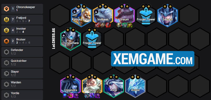 Một kiểu đánh khác cực kỳ thịnh hành trong mùa 16 hiện tại phải nói tới là các Tộc vùng đất (thường mốc kích 7) như Demacia, Frejlord, Ionia, Bilgewater, Noxus…. và cộng thêm các 5 vàng có thể kích Hệ trong các slot còn lại.