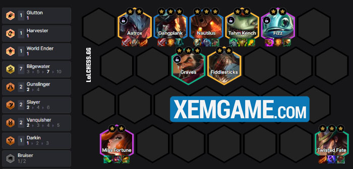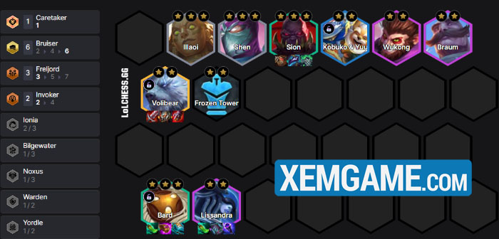 Với mọi thứ đều bổ trợ khả năng reroll như vậy thì việc còn lại là tìm một khung bài hợp lý để đi cùng hắn. Ở đây chúng ta có Sion – dù đã bị nerf từ đầu PBE nhưng khả năng tích máu của hắn sau mỗi giao tranh vẫn rất khỏe và qua đó chúng ta có bộ đôi song sát Sion – Bard cùng các tướng Đấu Sĩ rẻ tiền để roll chung :