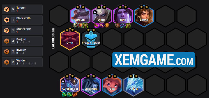 Tất nhiên mục tiêu của chúng ta là kiếm đủ 5 Targon để mở khóa Aurelion Sol đánh late, vậy nên cứ flex thoải mái đồ đạc (vì nhiều tướng đủ vai trò trong Targon), fast cấp và thêm bộ tướng bổ trợ vào là xong. Ở đây chúng ta có 3 tướng từ Frejlord để lấy Cột Băng công thủ toàn diện và Ornn để farm thêm đồ Tạo Tác là xong bài :