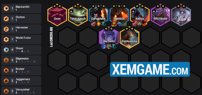 Về lối chơi thì chúng ta sẽ reroll Gangplank và Nautilus ở cấp 7 trước khi up lên 9 và tìm các tướng kích Hệ khác. Hoàn thiện bằng khung Aatrox, Fiddlesticks, Tahm Kench và Ornn để mang đến ngưỡng sức mạnh cao nhất.