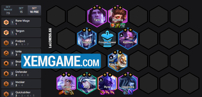 Trong đội hình Yunara Freljord ở đây chúng ta sẽ tập trung vào việc flex Yunara và 2 Ionia là Kennen Wukong để ghép vừa khít cùng team Freljord bao gồm Lissandra, Sejuani, Ashe. Kobuko và Yuumi là mảnh ghép cuối cùng để kích Đấu Sĩ, Thuật Sư, Taric là tướng Targon độc nhất và qua đó chúng ta đã kích 4 vùng đất Tộc và mở luôn Ryze ở 9.