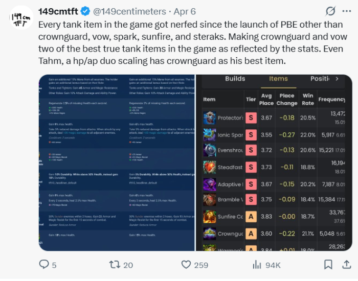 Theo đó một đợt giảm sức mạnh trên diện rộng nhắm vào hầu hết các trang bị chống chịu chủ chốt, khiến không ít người chơi cảm thấy khó hiểu. Các trang bị quốc dân như Giáp Gai bị giảm giáp và lượng máu cộng thêm, Vuốt Rồng cũng không ngoại lệ khi bị cắt bớt chỉ số kháng phép. Ngay cả những món đồ đa dụng như Mũ Thích Nghi hay Thú Tượng Thạch Giáp cũng chịu chung số phận với việc giảm đáng kể khả năng chống chịu cơ bản.