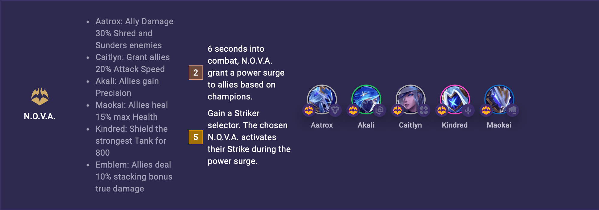 Nhìn chung, mỗi tướng N.O.V.A, sẽ cho đội hình được rất nhiều thứ cần thiết tùy tình huống. Ví dụ, Aatrox có khả năng Cào Xé Phân Tách kẻ địch 30%, điều này có nghĩa là bạn không cần phải lên các đồ hiệu ứng tương tự và qua đó có thể dồn đồ lên món khác thiết yếu hơn. Nhiều hiệu ứng khác cũng ngon không kém như Kindred cho 800 lá chắn cho tướng chống chịu, bên cạnh đó là Ấn cho cả hiệu ứng chuyển đổi sang sát thương chuẩn nữa.