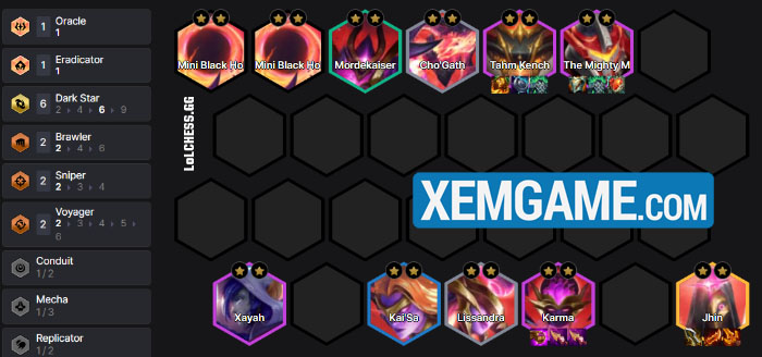 Cũng có khả năng là chơi đủ 4 Hắc Tinh cho đến cấp độ 9, sau đó sẽ roll để lên Jhin và có đủ 6 Hắc Tinh của lối chơi này. Thêm vào đó, Jhin hiện tại là carry vật lý mạnh nhất game, nên hãy để sẵn vài trang bị vật lý cuối game để flex cho hắn.