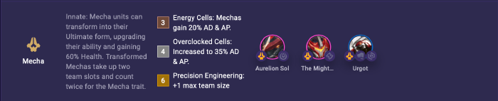 Nội tại : Tướng Máy Móc có thể biến thành dạng Tối Thượng, nâng cấp kỹ năng và nhận 60% Máu. Tướng Máy Móc đã biến hình cần 2 vị trí trong đội hình nhưng kích gấp 2 cho Tộc Máy Móc.