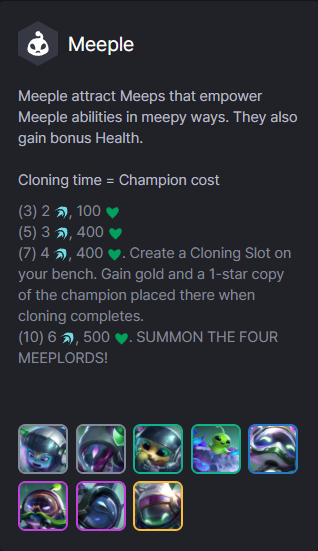 - (7) 4 Tiềm Năng, 400 Máu. Tạo nên một ô Nhân Bản trên hàng chờ. Nhận vàng và 1 phiên bản của tướng đặt trên ô đó sau vài vòng giao tranh (số vòng để nhân bản = số vàng cần mua tướng đó).