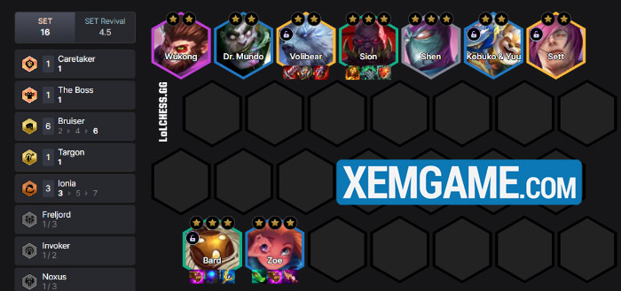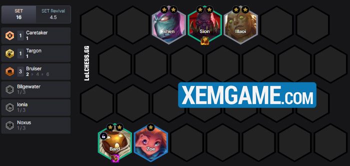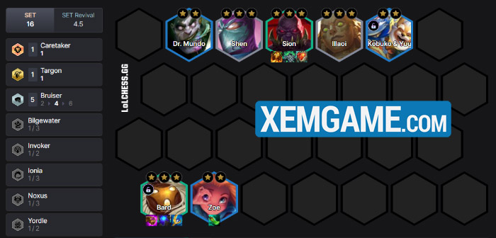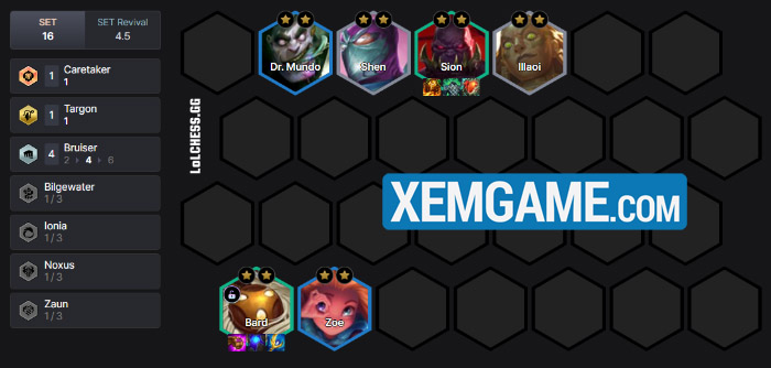 Về trang bị thì chúng ta lên cho Bard Bùa Xanh, Quyền Trượng, Găng Bảo Thạch trong khi đó Zoe có thể lên Shojin, Găng Bảo Thạch và Nanh Nashor, Volibear là các món đấu sĩ hồi máu dôi ra và Sion là 3 món tank thuần máu.
