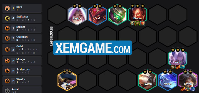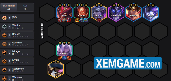 Tưng Tửng là carry Long Thần có cái giá 6 vàng và có thể ngẫu nhiên ra ở cấp 6 và 7, chúng ta sẽ tập trung reroll nó sau đó đẩy cấp trở lại 9 để tìm bộ tướng mạnh như Jayce, Hecarim và Xayah bổ sung chất lượng. Cấp 9 với Bard sẽ tròn bài Bang Hội và nếu có thêm Ấn Bang Hội cho Xayah thì quá max ping.