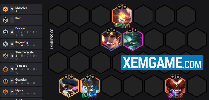 Theo đó, cách xây dựng vững chắc và thường thấy nhất chính là Terra làm carry chính, trong khi Ao Shin và Shyvana làm carry phụ – pháp sư và đấu sĩ phép tương ứng. Idas sẽ là mảnh ghép tank tiếp theo với 2 vị tướng Rakan và Bard ghép vào những Tộc/Hệ còn thiếu.