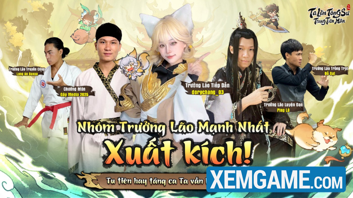 Bùng nổ nhất với Nhóm Trưởng Lão Mạnh Nhất – dàn KOL hàng đầu Việt Nam hóa thân thành các trưởng lão tông môn, tái hiện một ngày làm Tông Sư siêu chill: sai đệ tử luyện đan, trồng cây, đánh quái, trong khi bản thân ngồi uống trà ngắm mây trôi.
