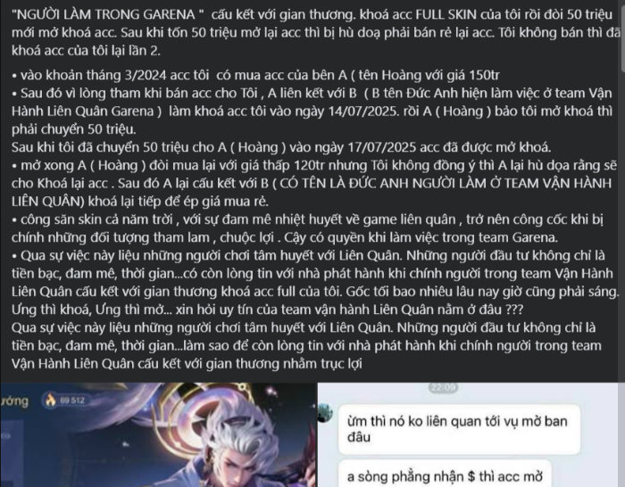 Cụ thể thì chủ bài viết ban đầu đã tố cáo một nhân viên trong Garena đã nhận khóa acc anh vừa mua từ một bên khác. Sau đó lại lằng nhằng chuyện mua lại để rồi chủ của chiếc acc này lại tiếp tục bị khóa sau đó.
