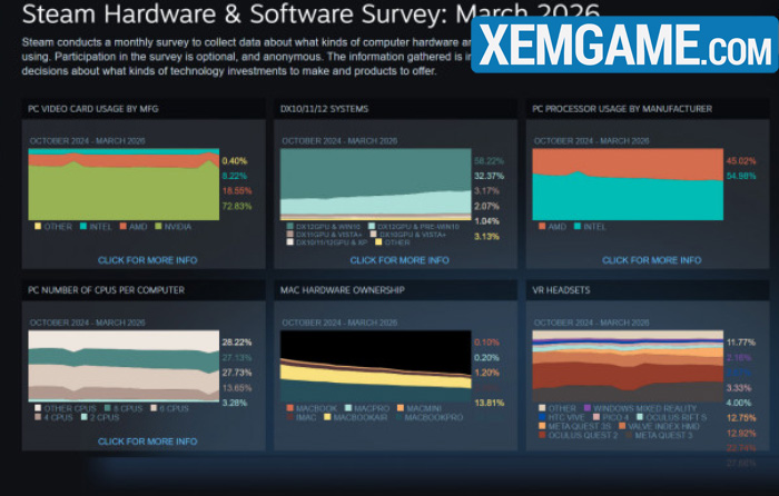 Valve công bố Khảo sát Phần cứng Steam hàng tháng, và bạn có thể tìm thấy dữ liệu đầy đủ tại URL này. Khảo sát theo dõi các đặc điểm phần cứng PC của người dùng như số lõi CPU, thương hiệu CPU, dung lượng RAM hệ thống, GPU được sử dụng, và thậm chí cả loại tai nghe VR nào phổ biến nhất với game thủ