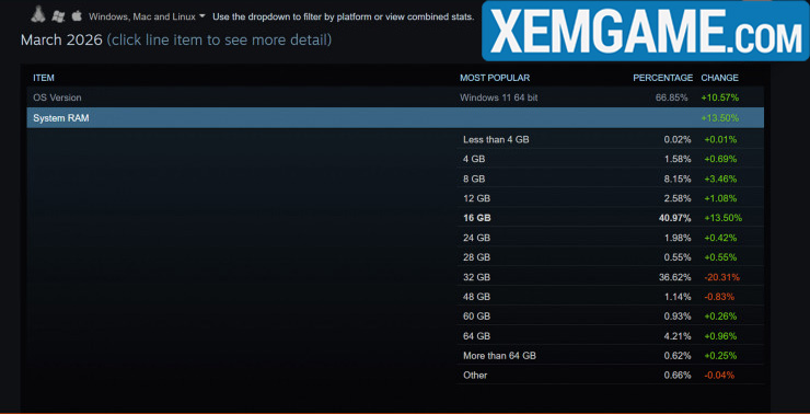 Để củng cố quan điểm rằng game thủ không hề từ bỏ cấu hình 32GB để nâng cấp lên RAM nhiều hơn, kết quả Khảo sát Phần cứng Steam mới nhất cho thấy cấu hình PC chơi game 16GB đã tăng 13,5%, trong khi hệ thống 12GB tăng 1,08% và hệ thống 8GB tăng 3,46%. Về mặt kỹ thuật, có sự tăng lên ở cấu hình 64GB (tăng 0,96%) và hệ thống 60GB (tăng 0,26%), nhưng những thay đổi này được cân bằng bởi PC 48GB giảm 0,83% và PC chơi game 4GB tăng 0,69%.