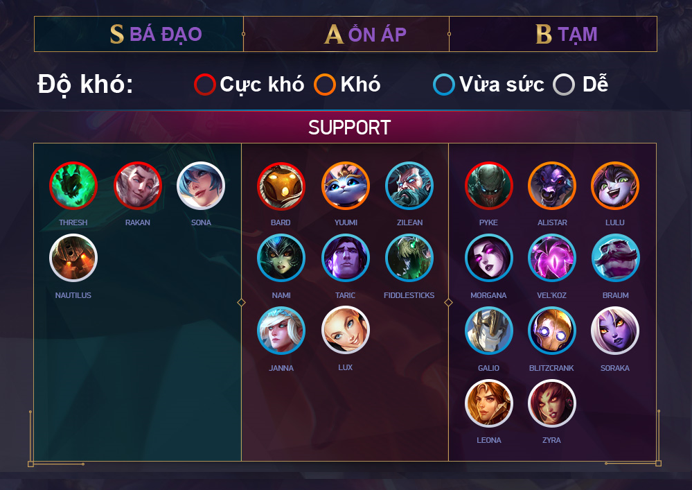 - Top tướng ở mức S (bá đạo) bao gồm: Thresh, Rakan, Sona và Nautilus